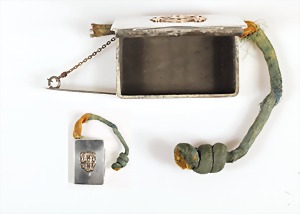 Sturmfeuerzeug 2.Hälfte 19.Jhd., Silber (geprüft), feines graviertes Monogramm in Gold 585/000 gearbeitet (CR oder GR), das Luntenfeuerzeug konnte auch bei widrigsten Bedingungen angezündet werden, 60,5 x 40,5 mm, ausgefallenes Raucherutensil !