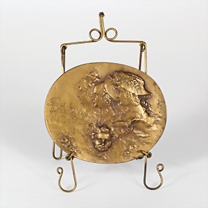 Fein gearbeitete Bronce-Plakette um 1910, Maße: 91 x 75,3 mm, "Drei Mädchenhaus", zusammenklappbarer Drahtständer. Das Dreimäderlhaus ist ein Singspiel in drei Akten von Heinrich Berté. Zentrale Figur der Operette ist der Komponist Franz Schubert.