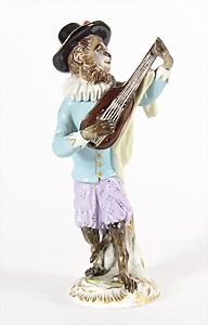 Porzellanfigur aus der Affenkapelle, MEISSEN um 1910/20, der "LAUTENSPIELER" (Entwurf: Johann Joachim Kaendler), Polychrom bemalt, Goldstaffage, Rocaillensoccel, H = 14 cm, zwei Zehenspitzen, sowie beide Hände sind bestoßen, am Mantel kl. Chip, der Abschluß der Laute fehlt. Die Affenkapelle, der skurrilste Klassiker des Meissener Barocks, gehört zum Genre der damals überaus beliebten „Singerien“