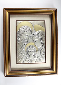 Heiligenbild, Silber 996/000, relliefartig geprägtes Bild mit der heiligen Familie: Maria, Josef u. das Jesuskind (in separatem Rahmen), Außenmaße: 43,5 x 34,5 cm, Holzrahmen, goldfarben u. schwarz abgesetzt