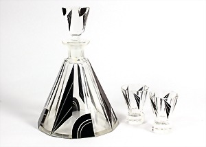 Glaskaraffe, ART-DECO" der 1920/30er Jahre, geschliffenes Kristallglas mit graphischen Flächen (schwarz abgesetzt), eingeschliffener Glasstöpsel, 2 paßende Gläschen (Gläschen an den Rändern mehrfach angechipt)