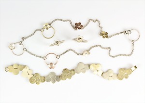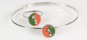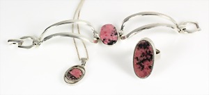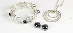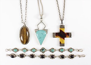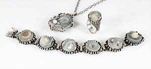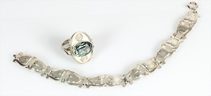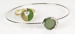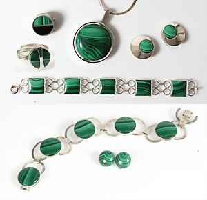 Lot Schmuck: Silber u. Malachit, 1 Brosche D = 23,5 mm; 1 Armband, 5 Malachitplatten (15,5 x 15 5 mm, L = 19,5 mm; 1 Armband, 5 Malachitplatten (18 mm), untergebautes Kastenschloß mit 2 Sicherheitsachten, L = 18,5 mm; 1 Anhänger, Malachit, D = 43 mm, 1 Kette, L = 45,5 cm; 1 Paar Ohrclips, D = 25 mm; ; 1 Paar Ohrclips, D = 13,5 mm; 1 Ring, RW ca. 53 (verstellbar !);