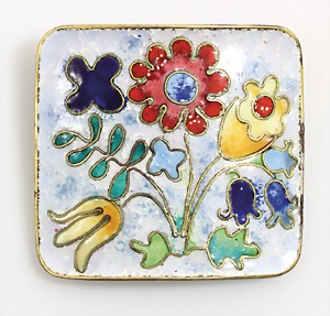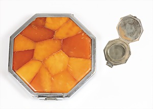 Schminkutensil, SBM, Metall vers., Deckel mit Bernsteinintarsien "BUTTERSCOTCH", seitliche Sicherungsklappe, D = 75,5 mm (beim innere Deckel fehlt kl. Nase zum Öffnen, geht trotzdem gut auf !)