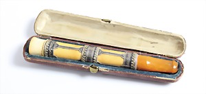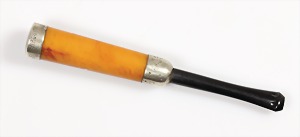 Zigarrenspitze um 1880/90, Bernstein "BUTTERSCOTCH", Meerschaum, fein verziertes mit Girlanden versehenes Silberblech, L = 114,8 mm, Originalschatulle (Mundstück lose)