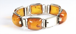Bernsteinarmband mit "INSEKTEN" Mitte 20.Jhd., Silber 835/000, sig: SBM, 6 rechteckige Bernsteincabochons "BUTTERSCOTCH" ca.19,0 x 16,0 mm, Kastenschloß mit Sicherheitsacht, L = 18,7 cm