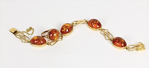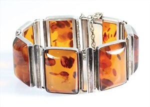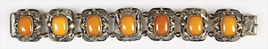 Bernsteinarmband "FISCHLAND" Mitte 20.Jhd., Silber 835/000, sig: GH, 7 rechteckige cognacfarbene Bernsteincabochons, beweglich aufgetiefte Zwischenglieder, Bernbstein ca.26,5 x 19,5 mm, mit Sicherheitskettchem, L = 21 cm