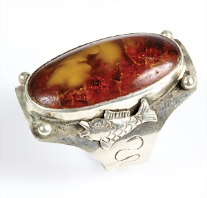 Ring, "FISCHLAND", Silber 835/000, sig.: GK T 12, Bernsteincab. Ca. 30 x 15 mm, RW. ca. 63