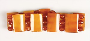 Bernstein-Armband "BUTTERSCOTCH", zwischen rechteckigen Bernsteinplatten (20,5 x 14,5 mm) liegen facettierte Oliven, 3-fach Gummizugband, B = 20,5, D = ca. 52 mm, total 13 g