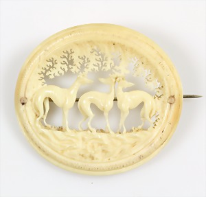 Brosche "ERBACH" um 1830, sehr fein geschnitztes Elfenbein, "JAGDHUNDE" auf einer Lichtung, 44,5 x 40 mm