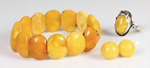 Lot Bernstein: "BUTTERSCOTCH": Armband, gespannte Platten auf doppeltem Gummizug, Breite = ca. 20,3 - 20,9 mm, Innen: D = 60,0 cm, 1 Ring Silber, RW ca. 57, 1 Paar Ohrstecker, D = 13,9 mm, total 19 g