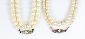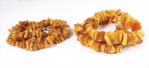 Lot: 2 Bernsteinketten, schmale Scheiben, 1 x ohne Schließe, L = 53 cm, 1 x weiße Schließe (Kette muß neu gefädelt werden), L = 65 cm, total 104,9 g
