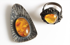 Lot Bernsteinschmuck: 1 Ring Silber, RW ca. 56; 1 Anhänger "FISCHLAND", Silber 835/000, H = 42,8 mm