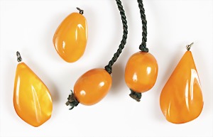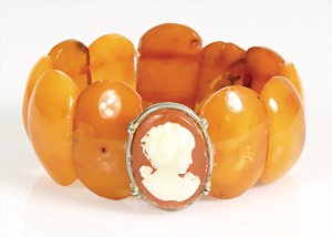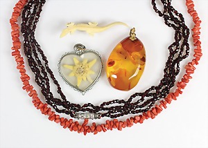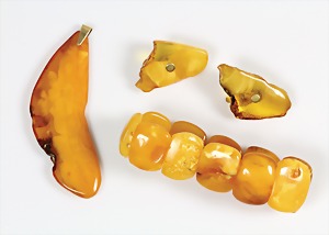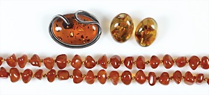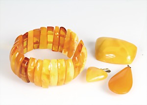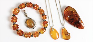 Lot Bernsteinschmuck: 1 Brosche mit Metallbroschierung, B = 62 mm; 2 Anhänger mit Ketten, Silber 925/000, L = je 60,0 cm, 1 Anhänger H = 38,3 mm, 1 Armband mit Gummizug u. Silberelementen, alles total 52,1 g