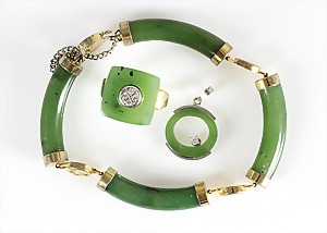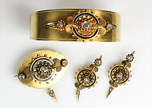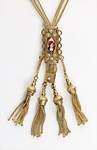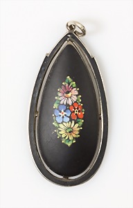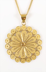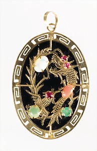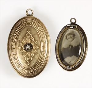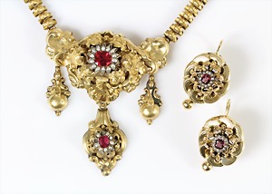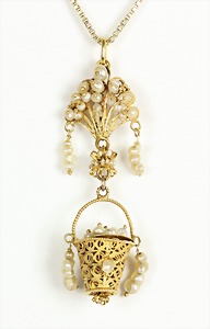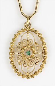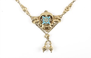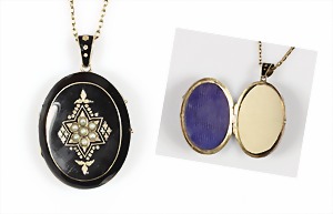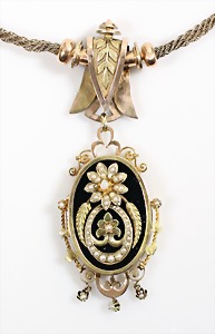 Collier um 1870/80, Anhänger/Medaillon in GG/RG 585/000, schwarze Onyxplatte wird verziert von einem ovalen Kranz u. einer Blumenrosette ausgefasst mit 1/2 Perlen, in der Rosette kl. Opal (beschädigt), rückseitig als Medaillon gearbeitet, eingeschliffenes Glas (orig.), Höhe des Anhängers ca. 95,5 mm; gedrehte Kette in GG 333/000, L = ca. 37 cm, total 39 g, sammelwürdig !