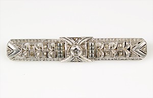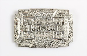 Brosche, ART-DECO 1920er Jahre, Amerika ? Punze leider nicht zu deuten , Platin (geprüft), 1 Altschliff-Diamant ca. 0,95 ct weiß-p 2, 178 Altschliff- und 8/8 Diamanten total ca. 4,7 ct weiß/p 1-2, à jour gearbeitet, Millgriffverzierung, zeittypische, streng geometrische Formgebung, 62,7 x 41,5 mm, total ca. 26,4 g, die Abstandsverzierung (seitlich) sind an 5-6 Stellen nicht mit dem Gader verbunden, sowie alte Reparaturstellen