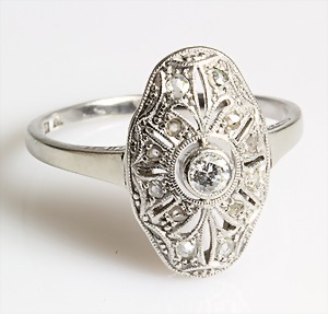 Ring ART-DECO der 1920er Jahre, WG 585/000, zentraler Brillant ca. 0,07 ct weiß, 12 Diamantrosen weiß, RW ca. 52