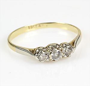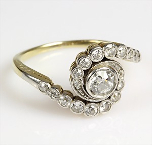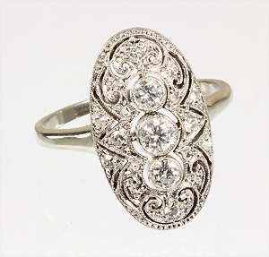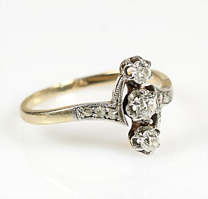 Ring ART-DECO der 1920er Jahre, WG 585/000, 3 zentrale Brillanten ca. 0,30 ct tw/w-vsi/si, 12 Diamanten/Rosen weiß umlaufend arrangiert, RW 56