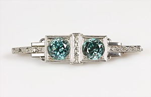 Brosche, feines ART-DEKO 1920er Jahre, Platin, 2 leuchtend blaue Steine (wohl Spinell), zentral 5 Diamanten, weiß, 6 Dia-Rosen (1 fehlt), L = 48,0 mm, (Brosche mit Reparaturstelle)