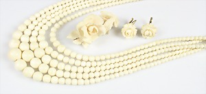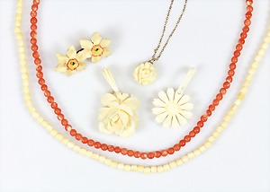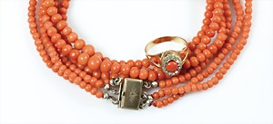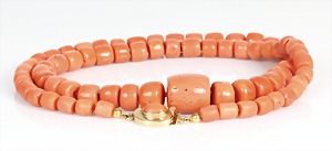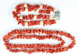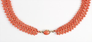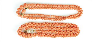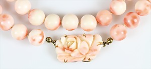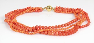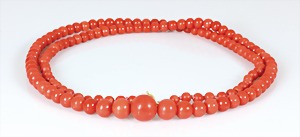 Korallenkette D = 9,2 - 10,0 mm, Mittelteil: gravierte Korallenrose in GG 585/000 (geprüft) gefasst, endlos, L = ca. 64 cm, total 79,5 g