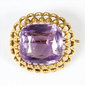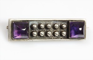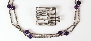 Lot: Kette Fa. "KUSTERER" Pforzheim Silber 925/000, Amethystkugeln D = 7 mm, L = 70 cm (endlos); Brosche Silber (geprüft), 38,5 x 30,5 mm