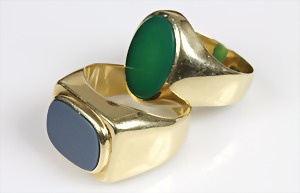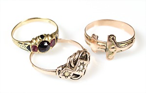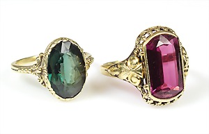 Lot: 2 Ringe Anfang 20.Jhd., GG 585/000, 1 Ring, synth. (Rubin (rot), RW ca. 51; 1 Ring, synth. Spinell (grün), RW 49 ( Stein bestoßen)