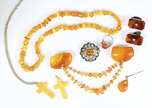Lot Bernsteinschmuck: diverses Silber/Double, 2 Ringe; 1Paar Ohrhänger; 1Paar Manschettenknöpfe; 4 kl. Anhänger; 1 Anhänger mit Kette; 1 Armband L = 18,3 cm u. 1 Kette Kette, total 132,6 g
