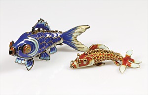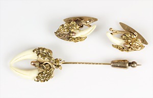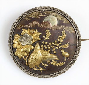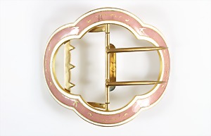 Gürtelschließe feiner "JUGENDSTIL" um 1900, Metall feuerverg., wolkenförmige Schließe, 4 Schwalben u. feines Ornament als Goldeinlage, Maße: 88 x 76,2 mm, aufwändige, ausgefallene Arbeit !