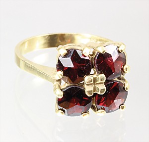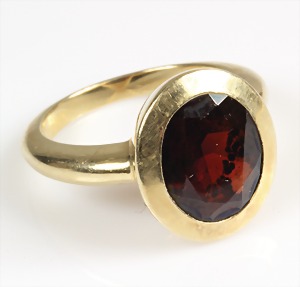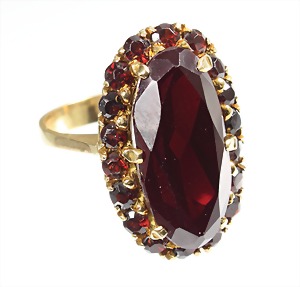 Ring, GG 750/000, zentraler Granat (im Navetteschliff) ca. 9,0 ct (21 x 9,7 mm), 19 facettierte Granate umlaufend, RW ca. 58, total 11,2 g