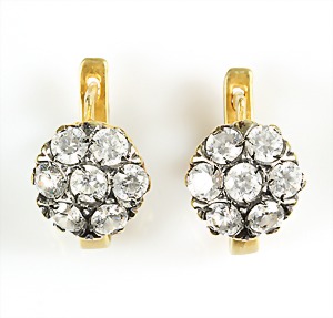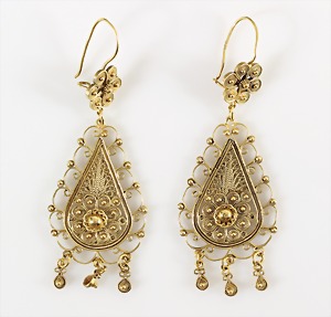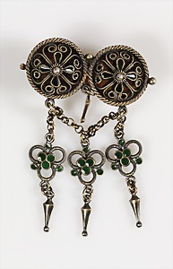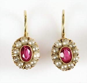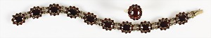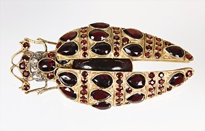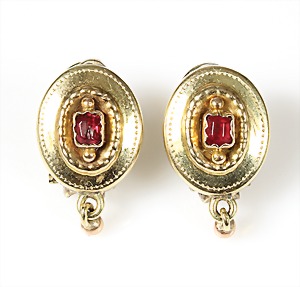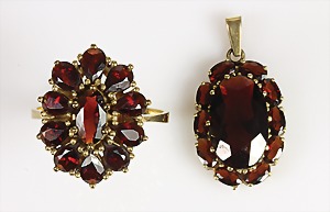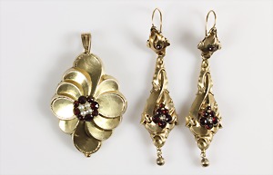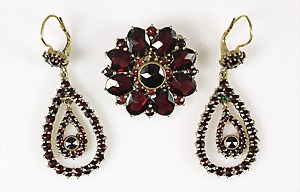 Lot Granatschmuck: Brosche, Tombak vergoldet, D = 29,5 mm; Ohrhänger mit Klappbügel, Silber 925/000 vergoldet, H = 49,0 mm