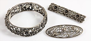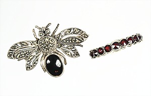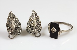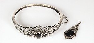 Lot: Schmuck mit Onyx u. Markasiten, Silber 925/000, 1 Armreif mit Scharnierbewegung u. integriertem Kastenschloß (Sicherheitskettchen), Innen: 54,5 x 51; Anhänger H = 35 mm