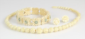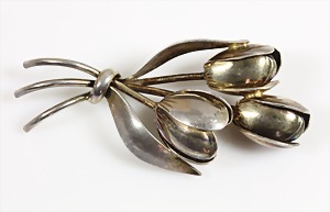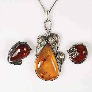 Lot Bernsteinschmuck: Silber, 1 Anhänger mit drei stilisierten Blättern H = 95 mm; Kette L = 61 cm, 1 Brosche/Anhänger mit Blüten 29,5 x 28,5 mm; 1 Brosche 36,5 x 24,5 mm