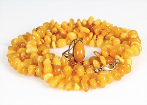 Lot Bernsteinschmuck: 1 Ring, Silber 835/000, RW ca. 58; 1 Kette mit Metallschließe teilw. goldfarb., flache Oliven ca. 18,5 x 15,6 mm, vorne 31,5 x 25,0 mm, Kette total 61,7 g, L = 71,5 mm
