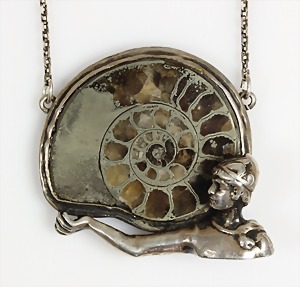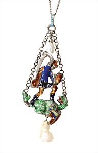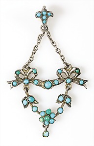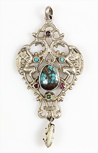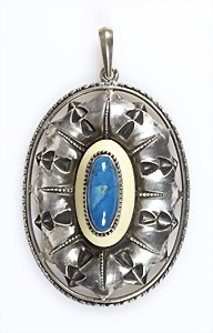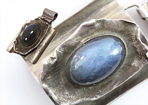 Anhänger, ENTWURF Fa. KAST Pforzheim, 1920er Jahre, signiert, Silber 900/000, bläulicher Cabochon der auf einem konischen Elfenbeinsockel sitzt, H = 62 mm