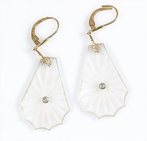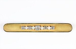 Brosche, ART-DECO 1920er Jahre, DEUTSCH, GG 585/000, Diamanten in weiß gefasst (Platin), 1 Altschliffdiamant ca. 0,16 ct weiß, 10 Diamantrosen, 49,5 x 8,8 mm