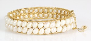 Armreif, GG 750/000, 70 Süßwasser-Perlen, Schließe seitlich zu Öffnen, Sicherheitskettchen, B = 14 mm, Innen: 60 x 50 mm, total 32,6 g