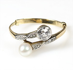 Ring "JUGENDSTIL" um 1900/10, GG 585/000, 1 Altschliff Diamant ca. 0,25 ct weiß, Diamantrosen, Steine weiß gefasst, 1 Perle, RW ca. 52 (innen kl. Spange damit der Ring besser sitzt)