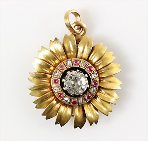 Anhänger, " BLÜTE", 2.Hälfte 19.Jhd., GG 750/000, zentraler Altschliffdiamant ca. 0,9 ct w-p, Naturals an der Rundiste, wird umrahmt von 8 Diamantrosen, 8 Rubincabochons und einem filigranen Blattkranz, D = 24,5 mm