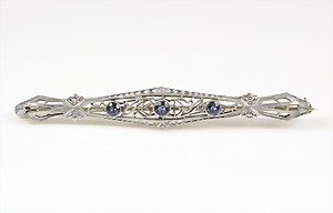 Brosche, ART-DECO, Amerika der 1920/30er Jahre, GG/WG 585/000, 3 kl. Saphire facettiert, L = 61 mm