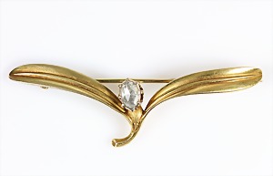 Brosche "JUGENDSTIL" um 1900/10, GG 585/000, sig: Kleeblattsymbol, 1 Diamantrose (ca. 6,1 x 4 mm) sie sitzt zwischen zwei Mistelblättern, L = 46,5 mm, feuervergoldet,