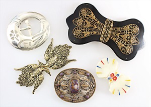Lot: 5 Gürtelschnallen 1.Hälfte 20.Jhd., Metall/Kunststoff, teilweise mit Steinbesatz