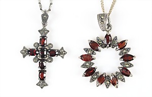 Lot Anhänger mit Granaten: Silber 925/000, 1 Kreuz, Granate u. Markasiten H = 83 mm; Kette, Silber 800/000, L = 51 cm; 1 Kranz, Granate (im Navette-Schliff) u. Markasiten D = 31,5 mm; Kette, Silber 925/000, L = 70 cm