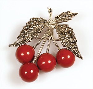 Brosche "KIRSCHEN" 1.Hälfte 20.Jhd., Silber 935/000, Markasiten, Silexkugeln, 39,5 x 38,5 mm