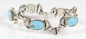 Armband, Mexico der 1970/80er Jahre, Silber, Türkise, untergebautes Kastenschloß mit Sicherheitskettchen, L = ca. 18,5 - 19 cm