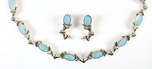 Lot: Collier u. Ohrhänger (beweglich), Mexico der 1970/80er Jahre, Silber, Türkise, Collier mit untergebautem Kastenschloß, L = ca. 42,5 cm; Ohrhänger (mit Stecker), H = 37 mm, total 130,4 g