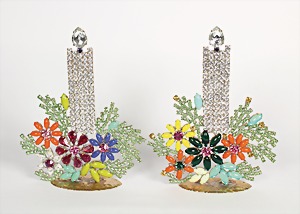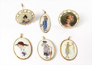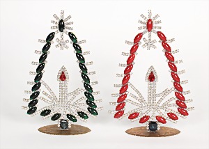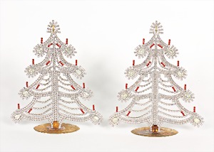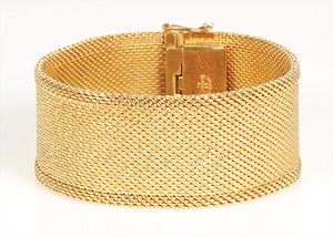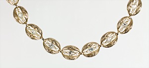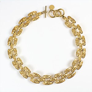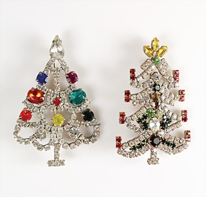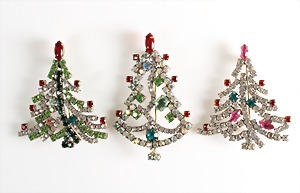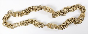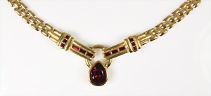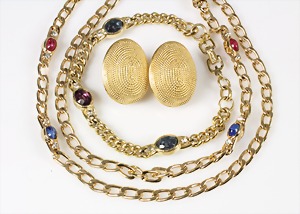 Lot Modeschmuck goldfarbenes Metall, 1 Kette, sig.: GROSSE, beidseitig eingefassste Cabochons in rot/grün/blau sowie weißer Strass, L = 90 cm; 1 Armband, sig.: GROSSE, blaue u. lilafarbene Steine (facettiert) sowie weißer Strass, L = 21 cm; 1 Ohrclips (mit Schraube einstellbar), sig.: NAPIER (50er Jahre), H = 25,5