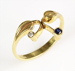 Ring, GG 585/000, 1 Brillant ca. 0,02 ct weiß, 1 Saphir facettiert, RW ca. 53