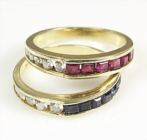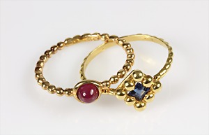 Lot: 2 Ringe GG 585/000, 1 Saphir im Carréschliff, 1 Rubincab., beide Ringe RW ca. 54