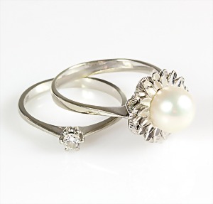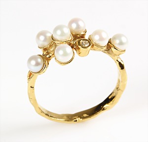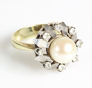 Ring, GG 585/000, 7 Akoja-Perlen D = 3,0 mm, 1 Diamant. weiß, RW ca. 51