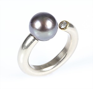 Ring, WG 585/000, Tahiti-Perle D = 9,8 mm, 1 Brillant ca. 0,07 ct tw-vsi (gelb gefasst), RW ca. 54