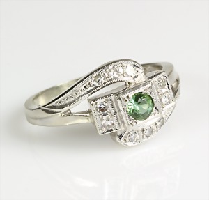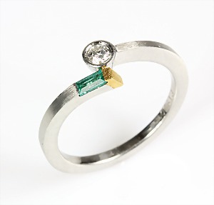 Ring, PLATIN 950/000, Feingold, 1 Brillant 0,10 ct tw-vsi (eingraviert), 1 Smaragdbaguett (sehr feine transparente Qualität), RW ca. 56